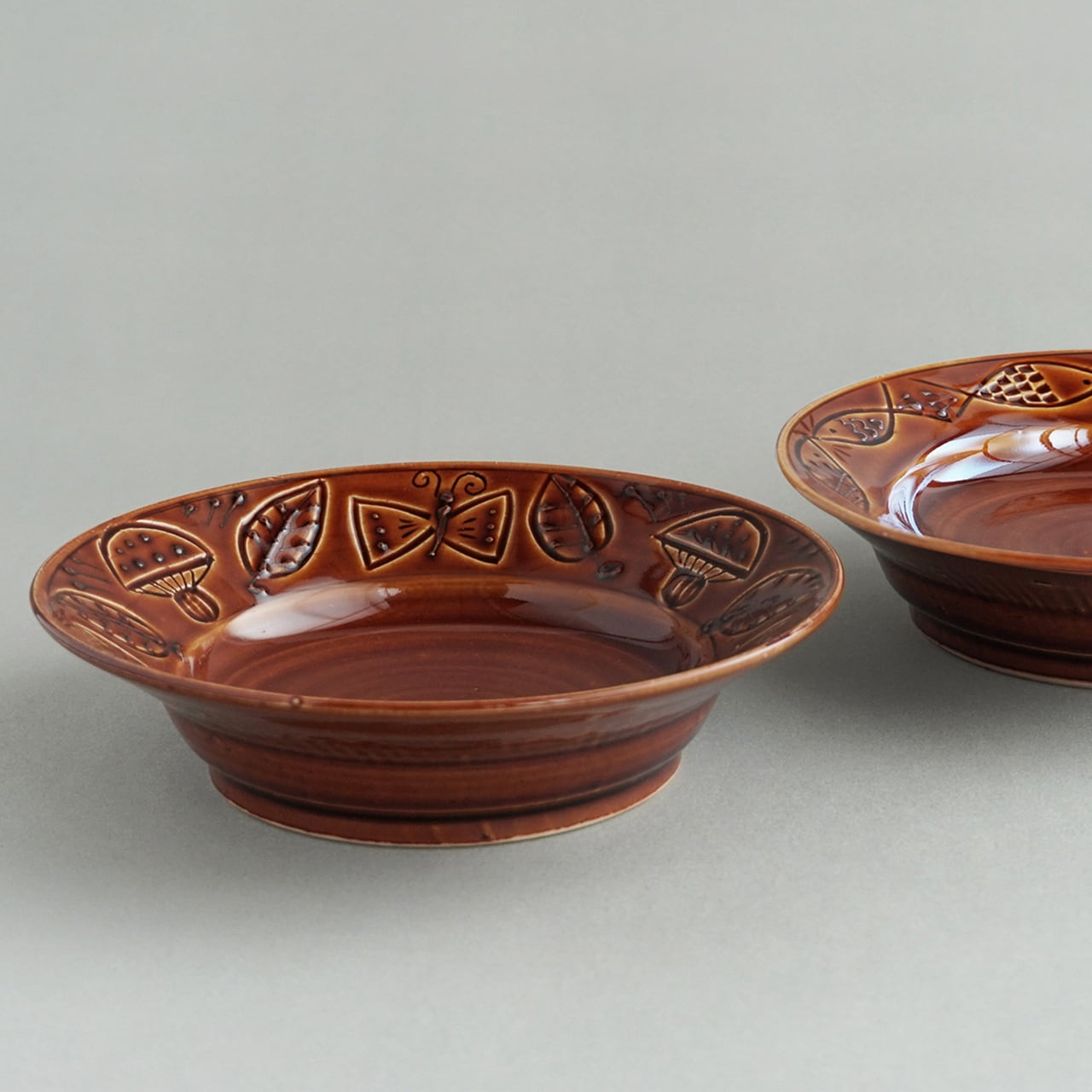 リム部分には、ひとつひとつ手彫りされた絵柄にイッチンという技法を用いて、森の生き物たちや魚の模様を描いています。艶のある飴釉の深い色合いと、どこか懐かしいような温かみのある絵柄が料理を賑やかに引き立ててくれます。パーティー等の華やかな食卓にいかがでしょうか。