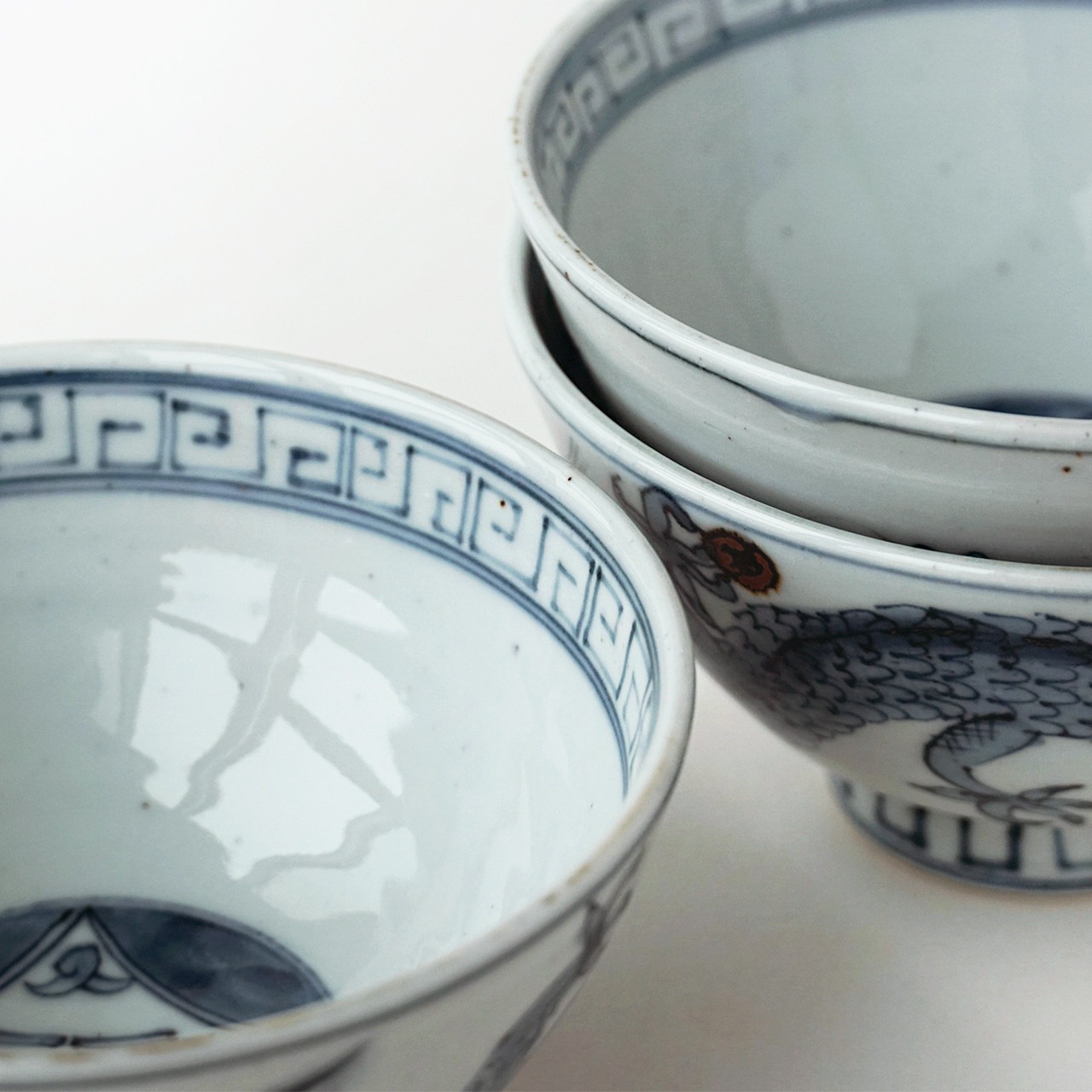 外側をぐるりと飛び回る龍と、内側には「逆さ福」や「雷紋」をあしらった縁起の良い絵柄のご飯茶碗です。軽快に飛び回る龍は表情も愛嬌があって、とても愛らしいです。