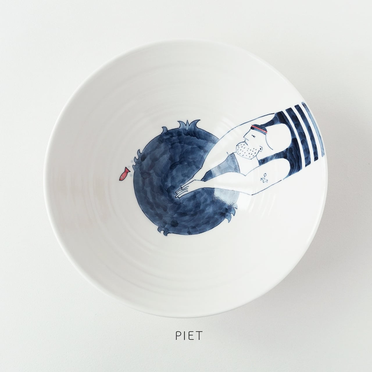 力強く飛び込むマッチョなPIET(ピート)さんと、ちょっと怖がり(?)なJAN(ヤン)さんの細かな表情や仕草を染付によって描いています。器全体に広がるロクロ目(ロクロをひいたときの指の跡)が波紋のようです。