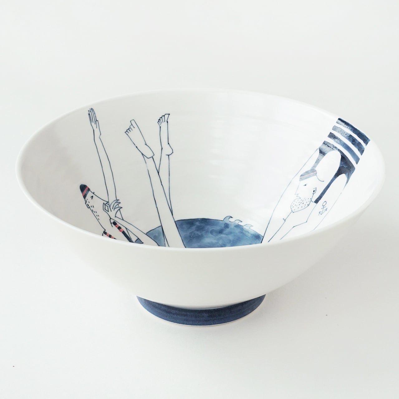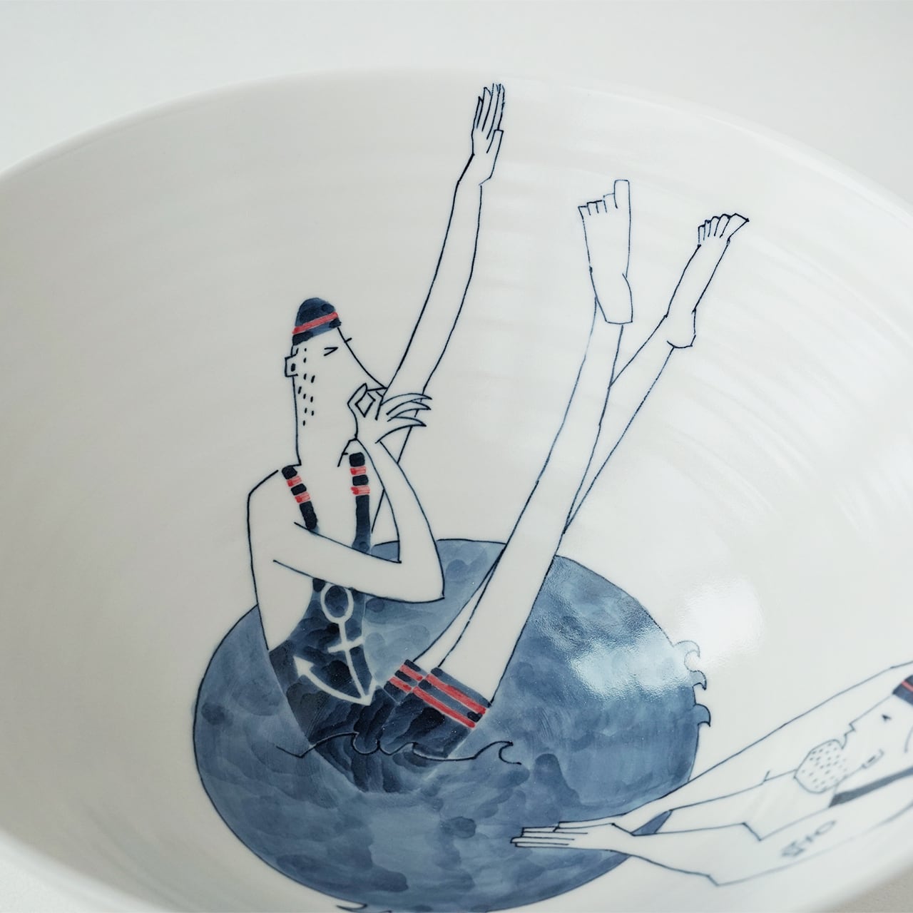 少しクリームががかった白地の中に、SAILOR(水兵さん)が水に飛び込む様子をモチーフにした一点もののボウルです。