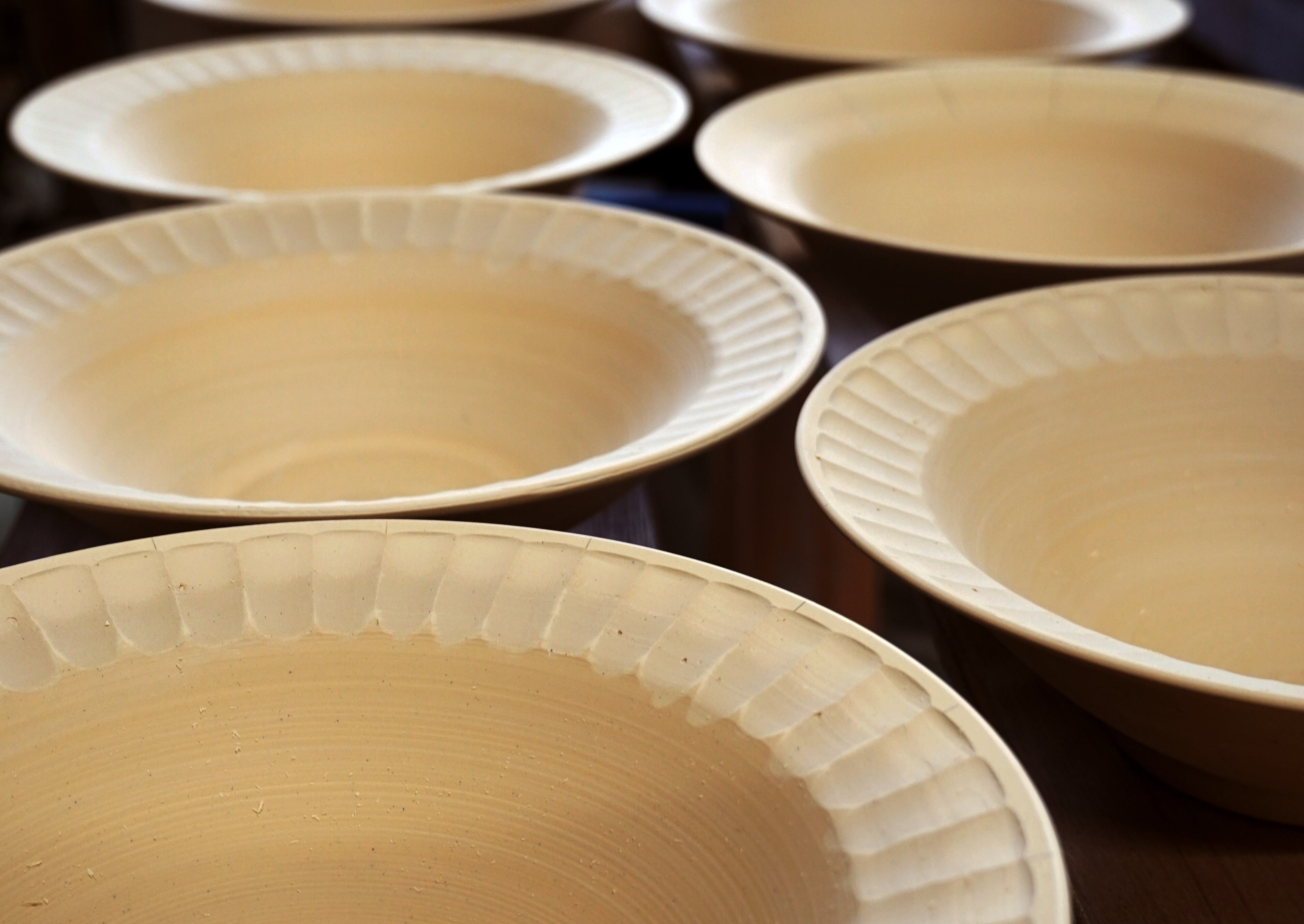 リムにぐるっと施したしのぎ(彫り)がアクセントの7寸(約21cm)のパスタ皿です。