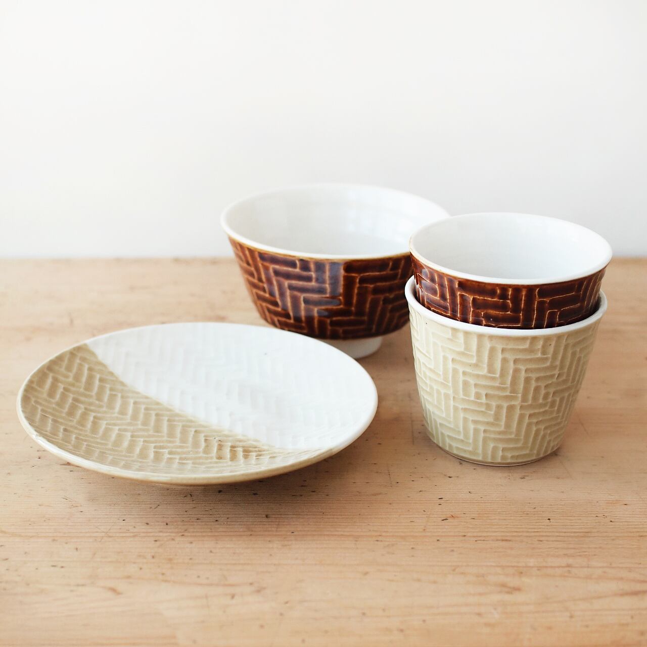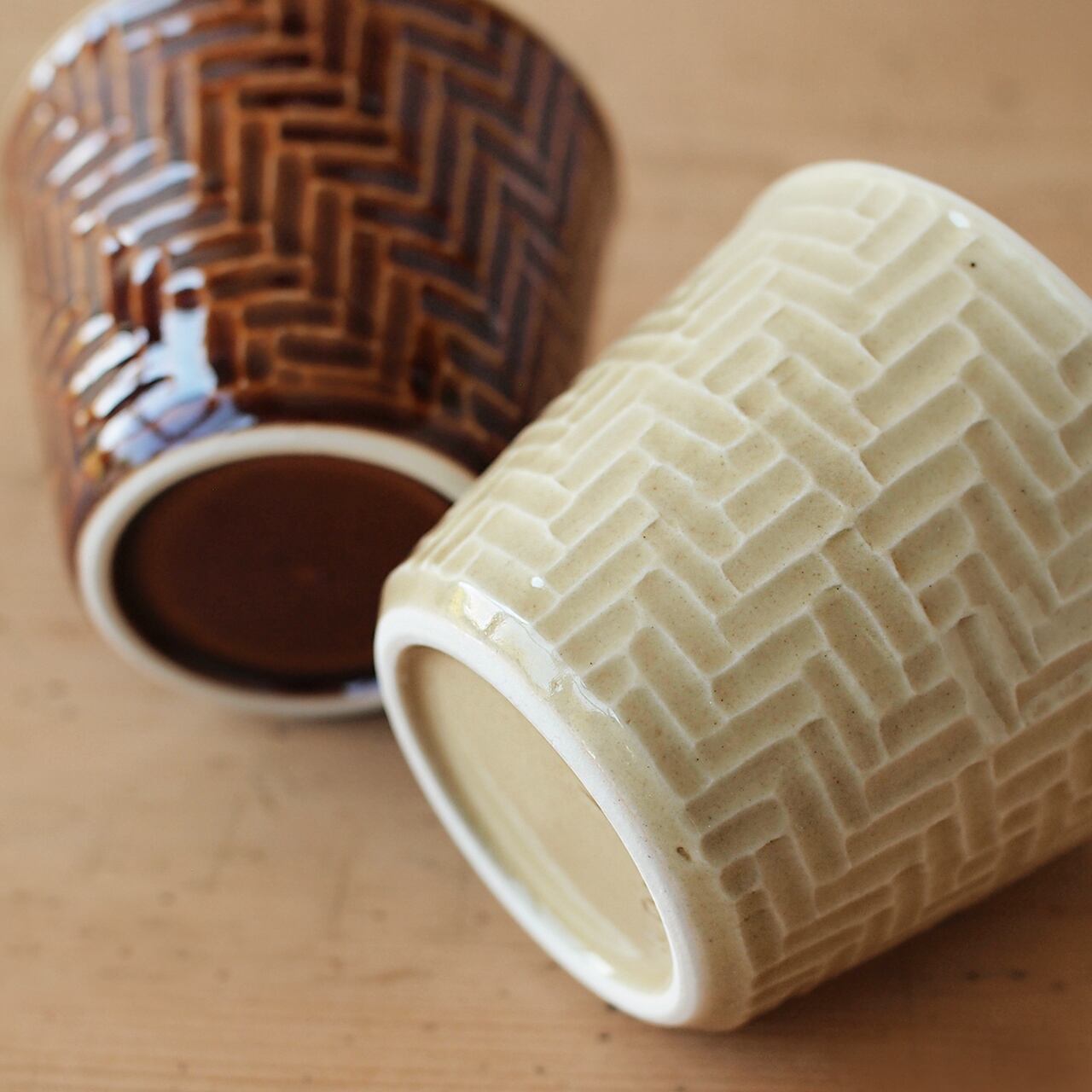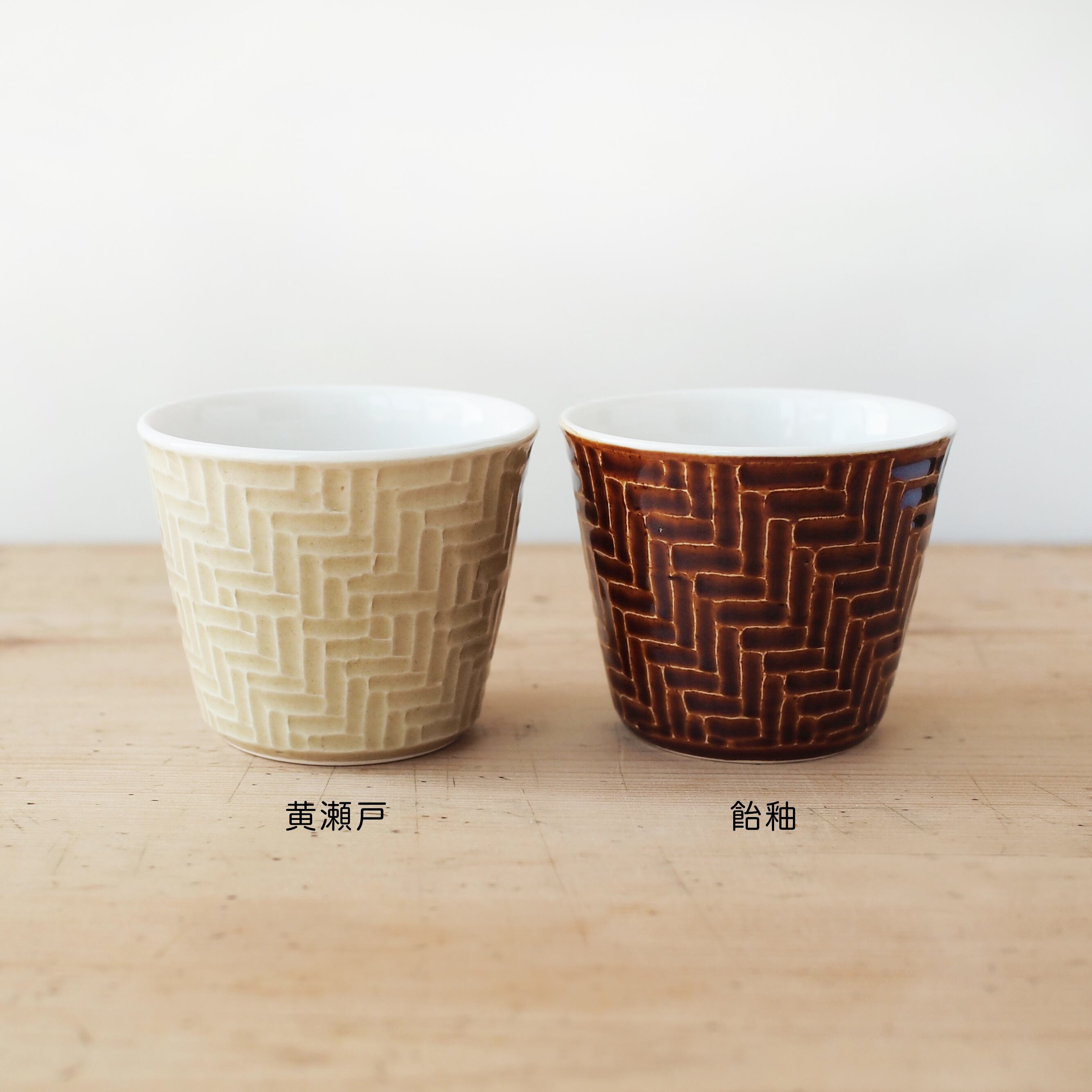 落ち着いた色味の「黄瀬戸」と、艶やかで深い色味の「飴釉」の2種類。内側と外側で掛け分けたコントラストがアクセントになっています。